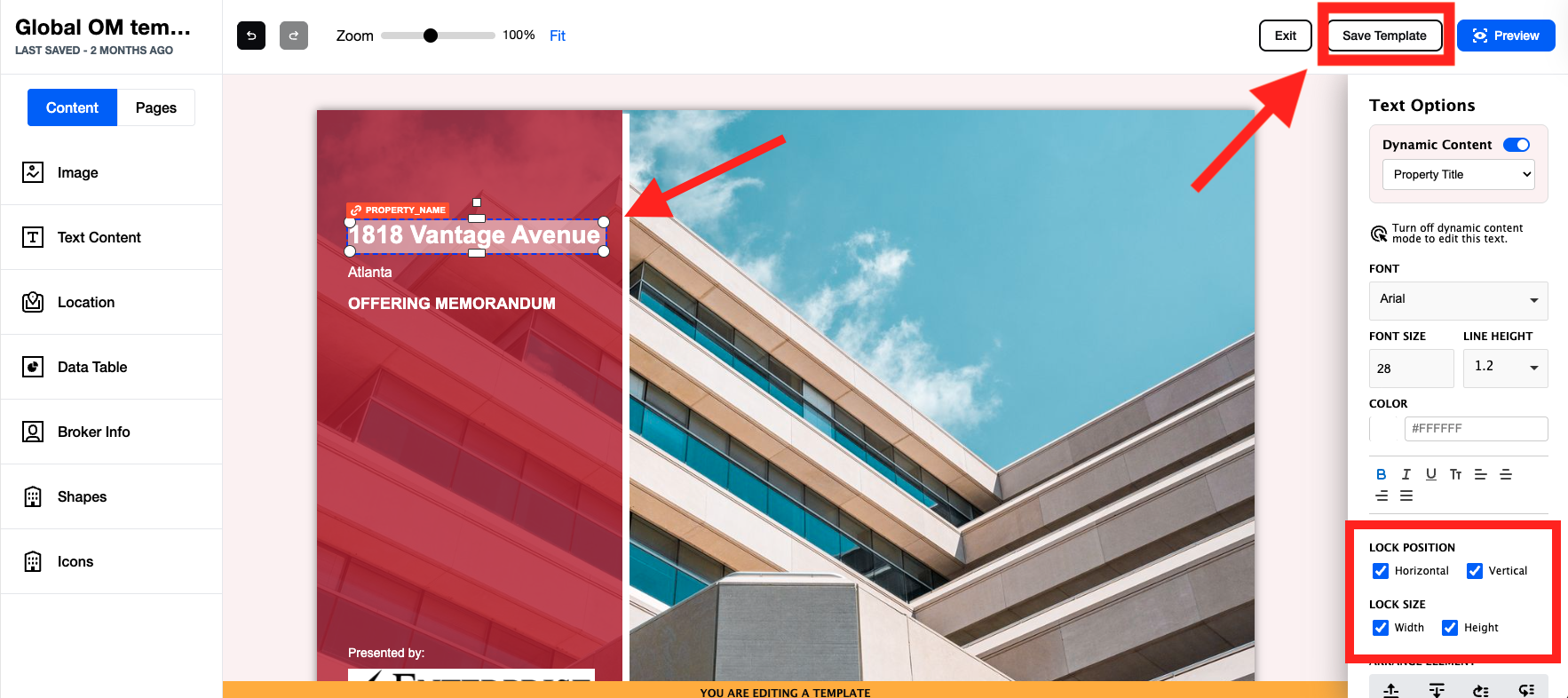 - Select an element on the flyer. You will see 4 check boxes to lock the selected element’s position and size, vertically and/or horizontally.